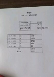 रौतहट, १४ असार । माध्यमिक शिक्षा परीक्षा (एसईई) २०८१ को नतिजा सार्वजनिक भएसँगै रौतहट जिल्लाका विद्यार्थीको समग्र नतिजा सार्वजनिक गरिएको छ । जिल्लाबाट यस वर्ष परीक्षा दिएका कुल ९ हजार २७३ जना परीक्षार्थीमध्ये ६ हजार ६०२ जना विद्यार्थी उत्तीर्ण भएका छन् भने २ हजार ६७१ जना अनुत्तीर्ण भएका छन् । यसअनुसार जिल्लाको उत्तीर्ण प्रतिशत ७१.२० प्रतिशत रहेको छ ।