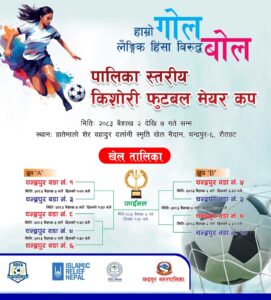 रौतहटको चन्द्रपुर नगरपालिकामा किशोरीहरूबीच प्रतिस्पर्धात्मक फुटबल प्रतियोगिता सुरु हुने भएको छ । “मेरो गोल, लैङ्गिक हिंसा विरुद्धको बोल” भन्ने सशक्त नारासहित पालिका स्तरीय ‘चन्द्रपुर मेयर कप किशोरी फुटबल प्रतियोगिता’ यही २०८३ साल बैशाख २ गतेदेखि ७ गतेसम्म सञ्चालन हुने भएको हो । रौतहट जिल्ला फुटबल संघका अनुसार प्रतियोगितामा चन्द्रपुर नगरपालिकाका १० वटै वडाबाट टोलीहरूको सहभागिता रहनेछ । प्रतियोगिताको उद्घाटन खेल चन्द्रपुर–१ र चन्द्रपुर–३ बीच हुने तय गरिएको छ । चन्द्रपुर–६ स्थित हातेमालो सामुदायिक वन, शेर बहादुर दर्लामी स्मृति खेल मैदानमा हुने खेलहरू दैनिक दुई चरणमा सञ्चालन गरिनेछन् । पहिलो खेल दिउँसो १ बजे र दोस्रो खेल दिउँसो ३ः३० बजे सुरु हुनेछ ।